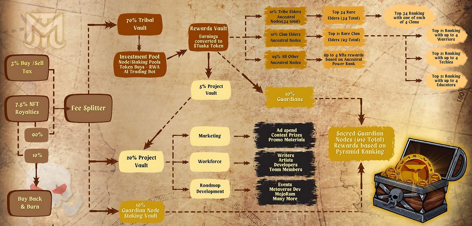The Fee Splitter accumulates 100% of the Fees levied on $TUSKS Token transactions, and 90% of all NFT Royalties (the other 10% is used to buyback and burn $TUSKS tokens).  These Fees are then split into three main vaults to be used as fuel for the MojoSphere economy and reward the Tribe as outlined in the figure below.